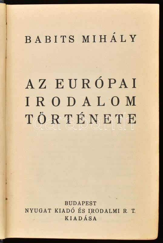 Babits Mihály: Az európai irodalom története. Bp., [1936], Nyugat, 728+(1) p. Kiadói aranyozott egészvászon-kötés, kissé kopott borítóval és gerinccel.
