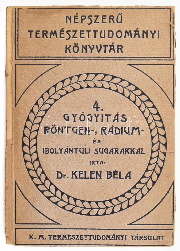 Dr. Kelen Béla: GyógyÃtás röntgen-, rádium- és ibolyántúli sugarakkal. Népszerű Természettudományi Könyvtár 4. Bp., 1923, Kir. Magyar Természettudományi Társulat. Kiadói papÃrkötés (Gottermayer-kötés), sérült borÃtóval, a gerinc hiányzik .