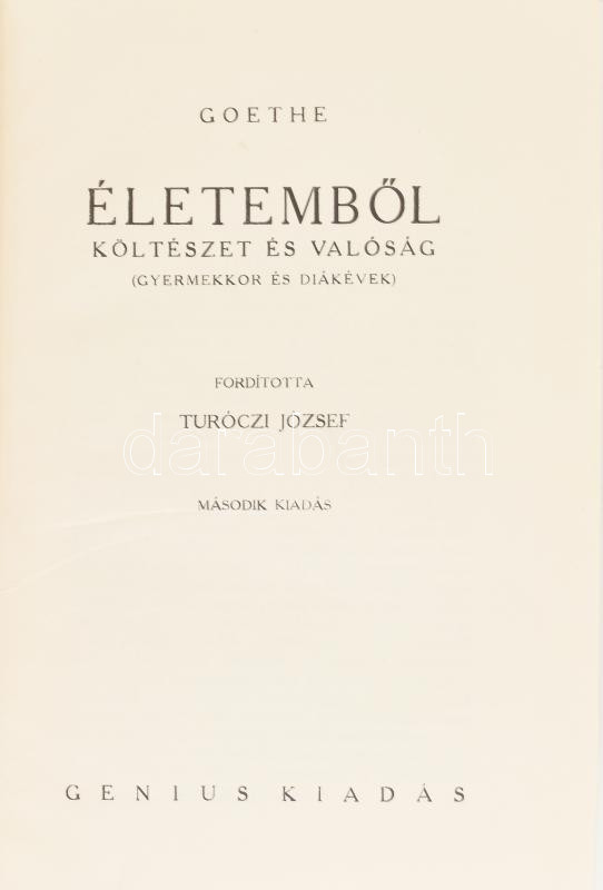 Goethe, [Johann Wolfgang von]: Életemből. Költészet és valóság. (Gyermekkor és diákévek). Ford.: Turóczi József. Bp., é.n., Genius (Világosság-ny.), 440 p. Második kiadás. Átkötött, aranyozott gerincű félvászon-kötésben, Gottermayer-kötés, nagyrészt jó állapotban.