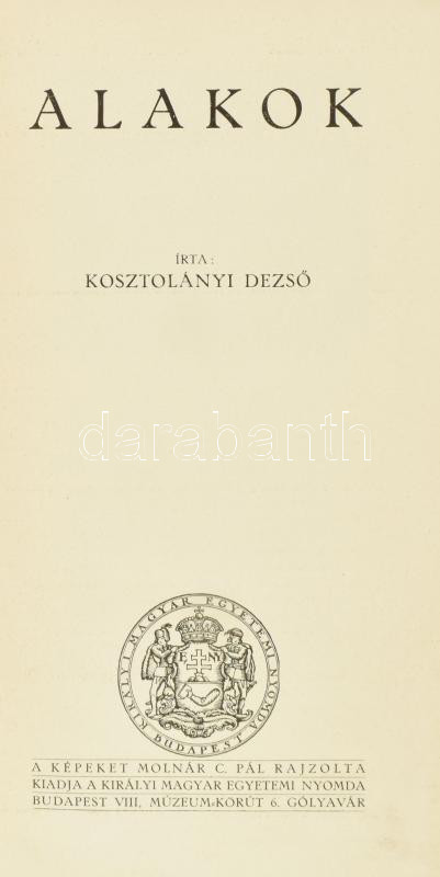 Kosztolányi Dezső: Alakok. Molnár C. Pál szövegközti illusztrációival. Bp.,[1929], Kir. M. Egyetemi Nyomda, 144+1 p. Első kiadás. Kiadói egészvászon kötés, foltos borítóval.
