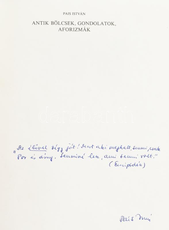 Pais István: antik bölcsek, gondolatok, aforizmák. A szerző által DEDIKÁLT! Bp., 1993, Szerzői kiadás. 4. kiadás. Kiadói egészvászon-kötés, kiadói papír védőborítón apró sérüléssel.