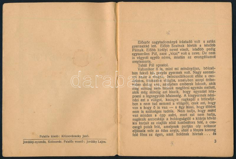 Leírás: Pál apostol. D. Kutter Hermann "Az Isten képeskönyve" c. művéből. Élő Könyvek 4. 1944, Ifjú Erdély Kiadása. Kiadói papírkötés, kopottas állapotban.