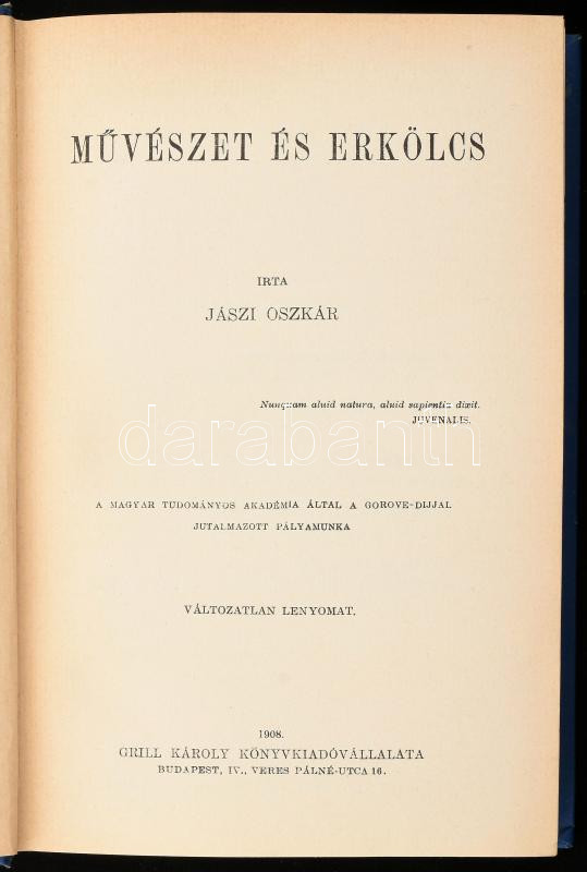 Jászi Oszkár: Művészet és erkölcs. Társadalomtudományi Könyvtár. Bp., 1908, Grill Károly, XX+439 p. Kiadói egészvászon-kötés, a gerincen kis sérüléssel.