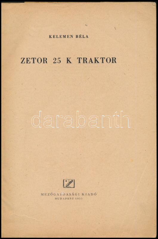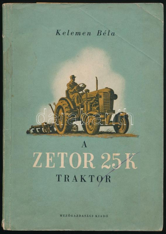 Kelemen Béla: A Zetor 25 K traktor. Bp., 1955, Mezőgazdasági Kiadó. Első kiadás. A borító Gönczi-Gebhardt Tibor munkája. Kiadói papírkötés, kissé foltos borítóval, kissé sérült gerinccel, néhány kissé foltos lappal. Megjelent 2100 példányban.