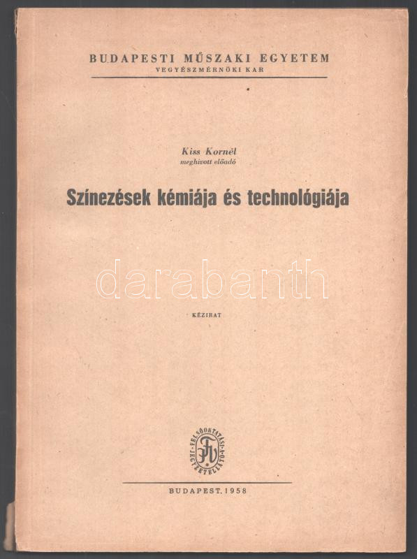 Kiss Kornél: Színezések kémiája és technológiája. Budapesti Műszaki Egyetem Vegyészmérnöki Kar. Bp., 1958., Felsőoktatási Jegyzetellátó Vállalat. Kiadói papírkötés, a gerincen szakadással. Megjelent: 26 példányban. Ritka!