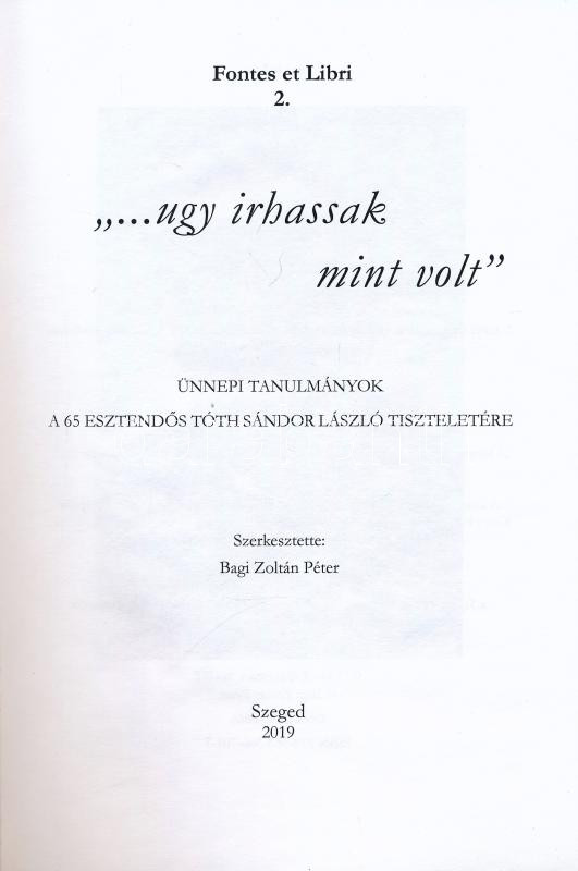 ... ugy irhassak, mint volt." Ünnepi tanulmányok a 65. esztendős Tóth Sándor László tiszteletére. Szerk.: Bagi Zoltán Péter. Fontes et Libri 2. Szeged, 2019., Szegedi Tudományegyetem Középkori és Kora Újkori Magyar Történeti Tanszéke. Kiadói papírkötés.