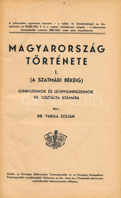 Dr. Varga Zoltán: Magyarország története I. (A szatmári békéig). Gimnáziumok és leánygimnáziumok VII. osztálya számára. Debrecen, 1941, Debrecen sz. kir. város és a Tiszántúli Református Egyházkerület könyvnyomda-vállalata, 149+(3) p. A szövegközi képeket Gáborjáni Szabó Kálmán rajzolta. Átkötött félvászon-kötésben, kissé sérült borítóval, a szövegben ceruzás aláhúzásokkal, széljegyzetekkel.
