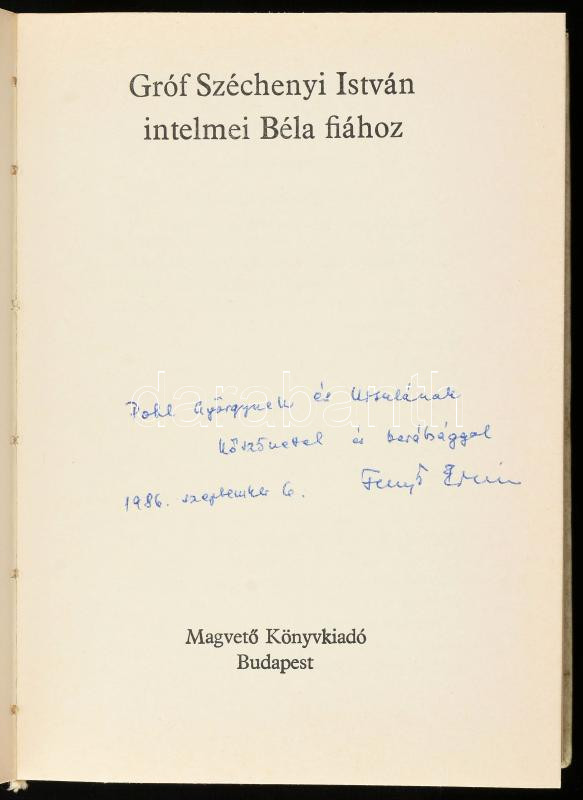 Gróf Széchényi István intelmei Béla fiához. A kötetet összeáll., a szöveget gondozta, az utószót és a jegyzeteket írta: Fenyő Ervin. Szigethy Gábor bevezetőjével. Magyar Hírmondó. Bp.,1985, Magvető. Kiadói kartonált papírkötés. A kötet összeállítója, Fenyő Ervin (1948- ) színész, író, Széchenyi-kutató által DEDIKÁLT példány.