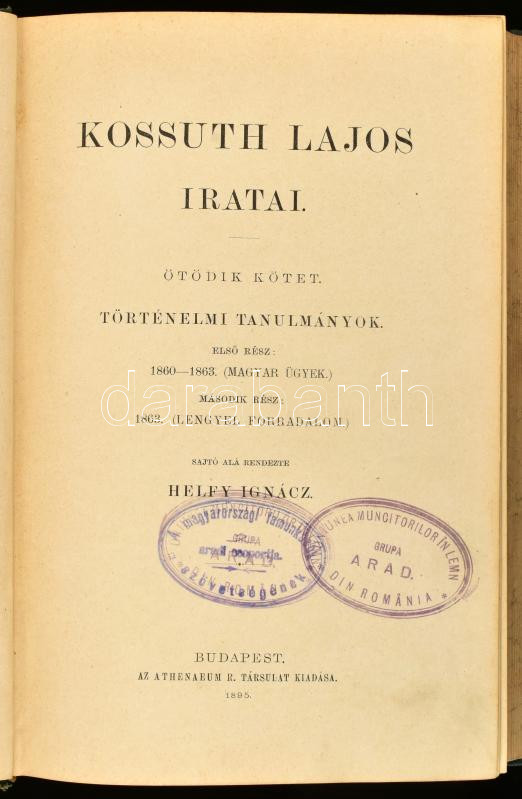 Kossuth Lajos Iratai. V. kötet: Történelmi tanulmányok: magyar ügyek 1860-63. Lengyel forradalom 1863. Sajtó alá rendezte: Helfy Ignác. Bp.,1895, Athenaeum, Kiadói aranyozott egészvászon kötésben, sarkán kopással