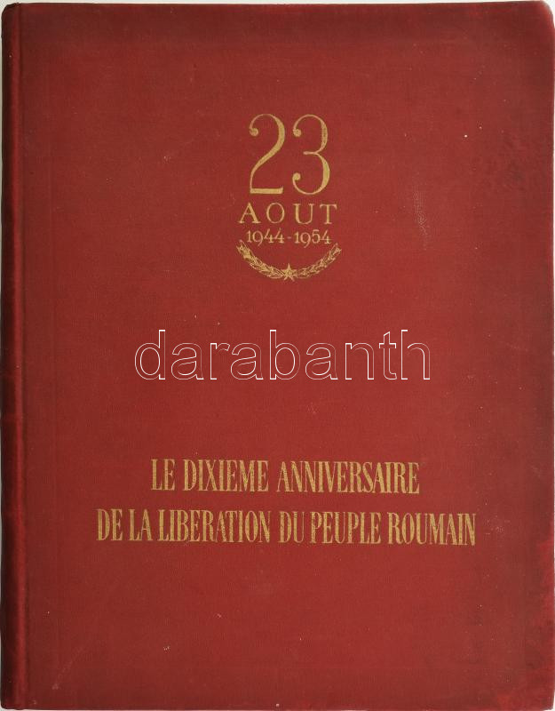 Le dixieme anniversaire de la liberation du peuple Roumain. 23 Aout 1944-1954. [A román nép felszabadulásának 10. évfordulója. Emlékkönyv / album]. Bucarest, 1954, L'Institut Roumain pour les Relations Culturelles avec l'Etranger. Fekete-fehér fotókkal gazdagon illusztrálva. Francia nyelven. Kiadói aranyozott egészvászon-kötés.