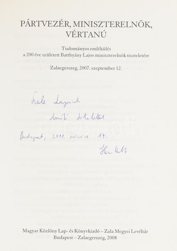 Molnár András (szerk.): Pártvezér, Miniszterelnök, Vértanú. Tudományos emlékülés a 200 éve született Batthyány Lajos miniszterelnök tiszteletére. Zalaegerszeg, 2007. szeptember 12. Az egyik szerző, (Hermann Róbert?) által DEDIKÁLT! Bp.-Zalaegerszeg, 2008, Magyar Közlöny Lap- és Könyvkiadó - Zala Megyei Levéltár. 240 p. Kiadói papírkötés.