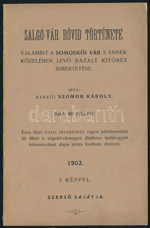 Kékkői Szomor Károly: Salgó-vár rövid története valamint a Somoskői vár s ennek közelében levő bazalt kitörés ismertetése. 1902, Szerző. Kiadói papírkötés, 5 képpel, jó állapotban.