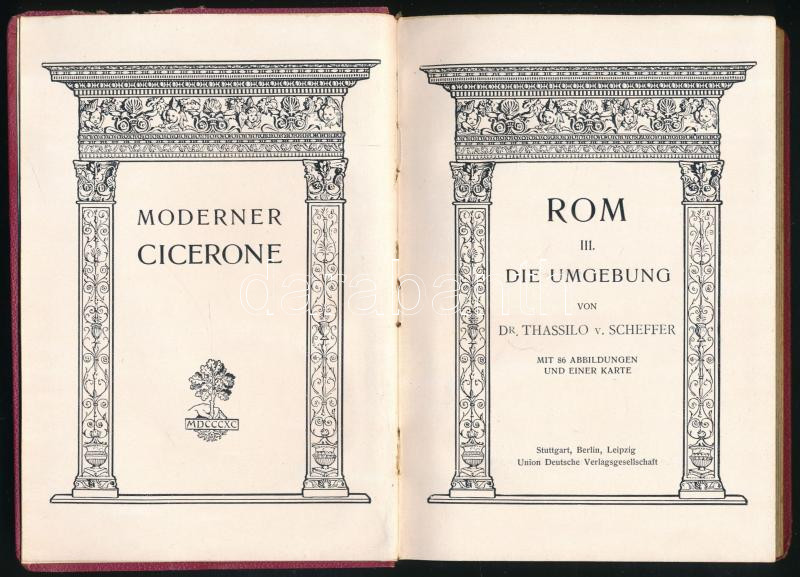 Scheffer, Thassilo von: Rom III. Die Umgebung. Moderner Cicerone. Stuttgart, [1903], Union Deutsche Verlagsgesellschaft. Gazdag szövegközi és egészoldalas, fekete-fehér képanyaggal. Német nyelven. Kiadói aranyozott egészvászon-kötés, kissé sérült borítóval, belül jó állapotban.