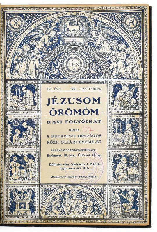1930-1931 Jézusom, örömöm. Havi folyóirat. Kiadja a Budapesti Országos Közp. Oltáregyesület. XVI. évf. 1-10. számai egybekötve, 1930. szeptember - 1931. június. Bp., Stephaneum-ny., 160 p. Fekete-fehér illusztrációkkal, köztük Márton Lajos munkáival. Korabeli félvászon-kötésben.