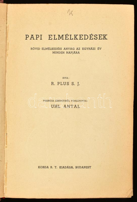 Leírás: R. Plus S. J.: Pap elmélkedések. Rövid elmélkedési anyag az egyházi év minden napjára. Ford.: Uhl Antal. Bp.,1938,Korda. Átkötött félvászon-kötés.