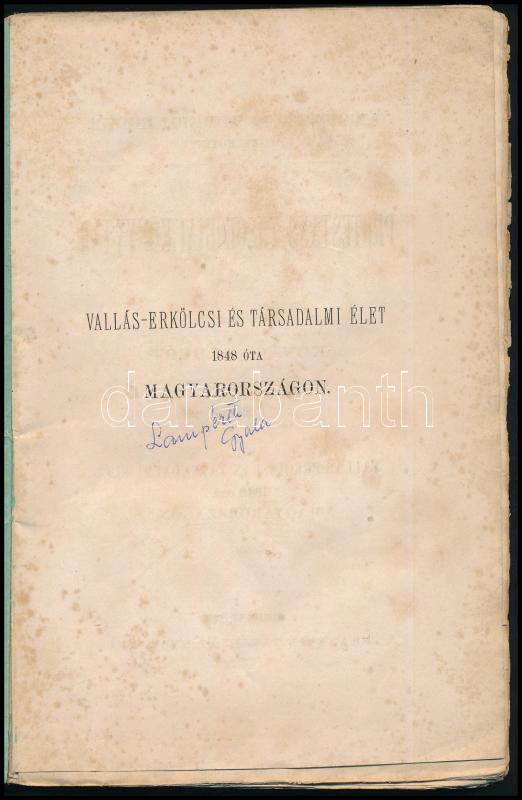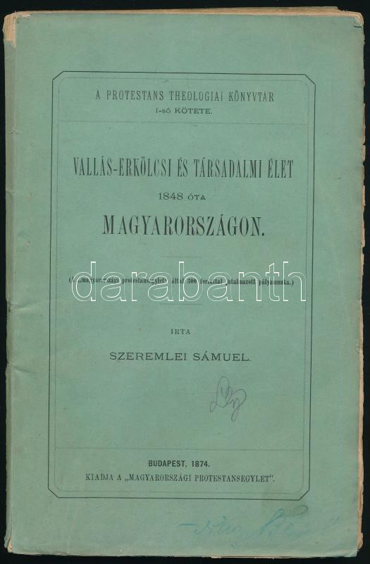 Szeremlei Sámuel: Vallás-erkölcsi és társadalmi élet 1848 óta Magyarországon. Protestáns Theologiai Könyvtár I. köt. Bp., 1874, Magyarországi Protestánsegylet (Franklin-ny.), VIII+113+(3) p. Kiadói papírkötés, kissé sérült borítóval, kissé foltos lapokkal, helyenként kissé sérült lapszélekkel.