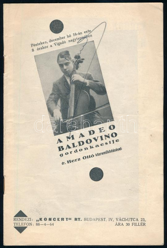 Leírás: 1932 Amedeo Baldovino (1916-1998) csellóművész aláírása egy zenei programfüzeten.