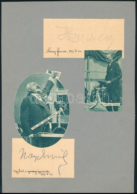 1937 Herczeg Ferenc (1863-1954) író, szerkesztő, a Magyar Revíziós Liga elnökének és Nagy Emil (1871-1956) igazságügy-miniszter aláírásai papírlapokon, kartonlapra ragasztva, mellettük újságkivágásos arcképeikkel.