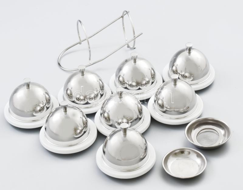 Leírás: 8 darab vajtartó porcelán edényke fém fedővel hozzá néhány egyéb eszköz