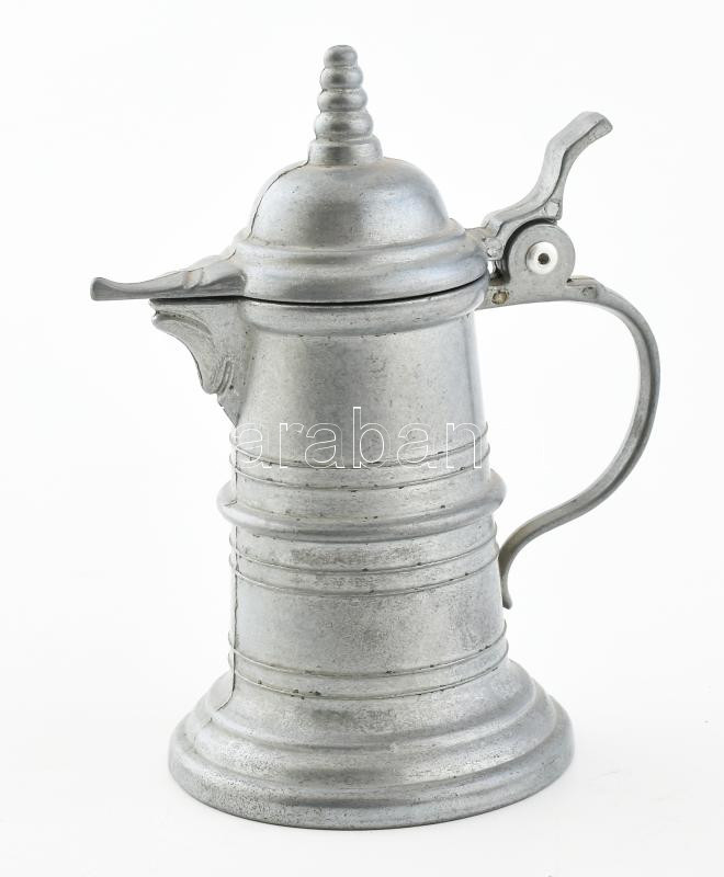 Leírás: Ón díszkancsó, fedeles, jelzéssel, m: 13 cm