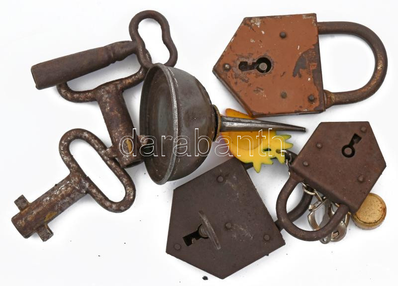 Leírás: Régi Singer varrógép olajozó, fém, h: 8 cm + vegyes régi lakatok és kulcsok