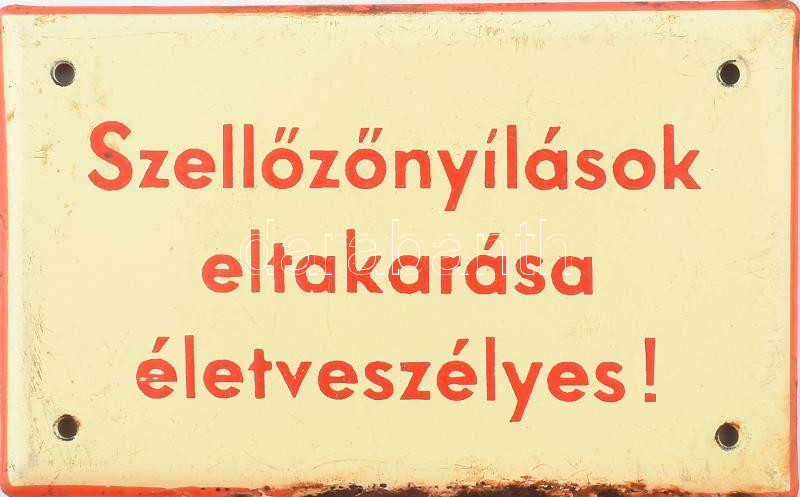 Régi zománcos tábla, "Szellőzőnyílások eltakarása életveszélyes!&... https://www.darabanth.com/hu/448-Gyorsarveres/448.0/Mutargy-papirregiseg-egyeb/Bolhapiac~1000014/Regi-zomancos-tabla-Szellozonyilasok-eltakarasa-eletveszelyes-kopassal-10x16-cm~II2970122