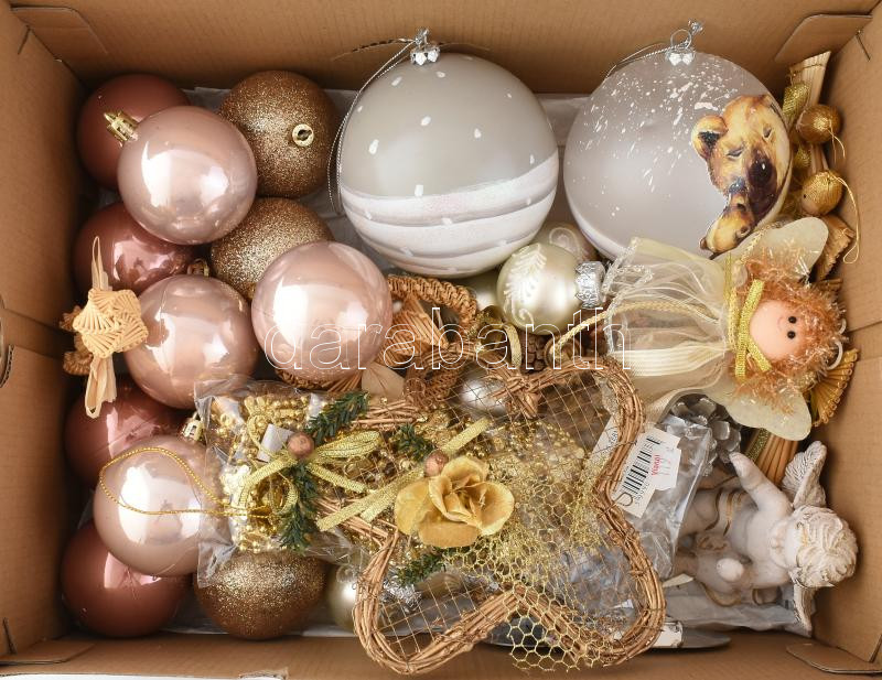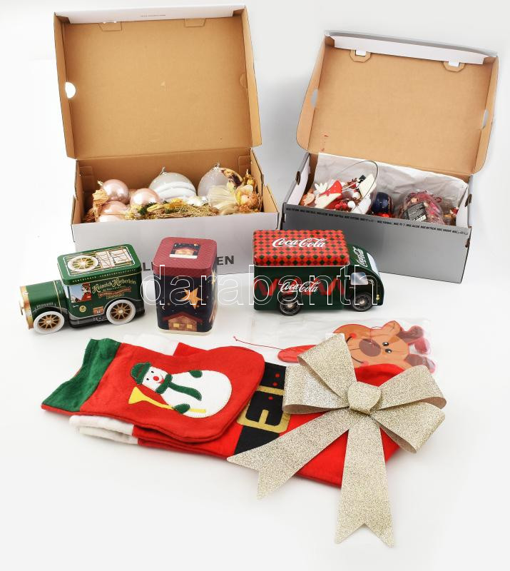 Több doboznyi karácsonyi dekoráció tétel: koszorú, üvegkínáló, asztaldíszek, lakásdíszek, potpourri, karácsonyfadíszek, üveggömbök, autó alakú fémdoboz, zenélő szerkezetes fémdoboz, jó állapotban
