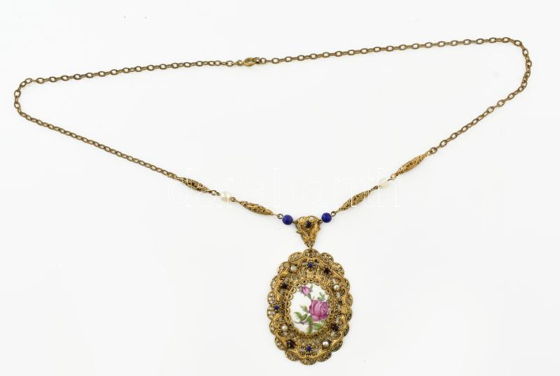 Leírás: Antik bronz nyakék, porcelán és kő berakásokkal, 5,5x4 cm