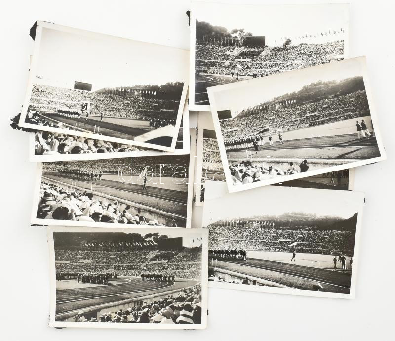 Leírás: 1960 Róma, az olimpia megnyitóünnepségéről készült (amatőr) felvételek, 8 db fotó, hátoldalukon albumba ragasztás nyomaival, 9x6 cm körül