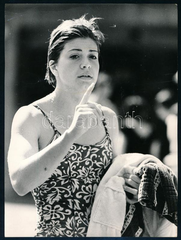 Leírás: 1973 Gyarmati Andrea úszó, olimpikon, sajtófotó, a hátoldalon feliratozott, pecséttel jelzett, 24x18 cm