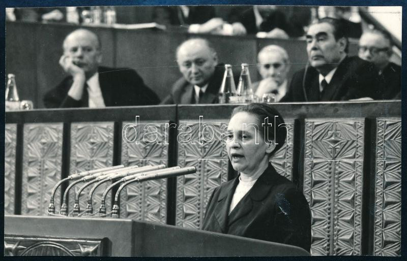 1975 Az MSZMP XI. kongresszusa, Benke Valéria, a Politikai Bizottság tagja (mögötte Leonyid Brezsnyev), sajtófotó, a hátoldalon feliratozott, pecséttel jelzett, 13x8 cm
