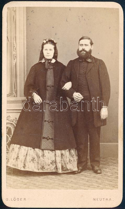 Leírás: cca 1870 Előkelő házaspárt portréja, keményhátú fotó Löger Gusztáv nyitrai műterméből, 10,5×6,5 cm