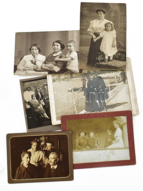 Leírás: cca 1900-1930 Családi képek, 6 db keményhátú fotó, vegyes állapotban, 10x6,5 cm és 16x11 cm között
