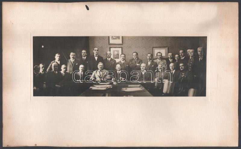 cca 1930 Az Országos Testnevelési Tanács gyűlése, középen (ülő pozícióban) Klebelsberg Kuno (1875-1932) vallás- és közoktatásügyi miniszter, tőle balra Karafiáth Jenő (1883-1952) elnök. Fotó, kartonra kasírozva, a karton szélén kisebb lyukkal, 28,5x10 cm