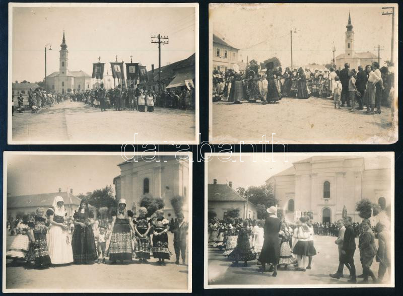Leírás: cca 1930 Mezőkövesdi életképek, népviselet, körmenet, 4 db fotó, foltos, 8,5×11 cm