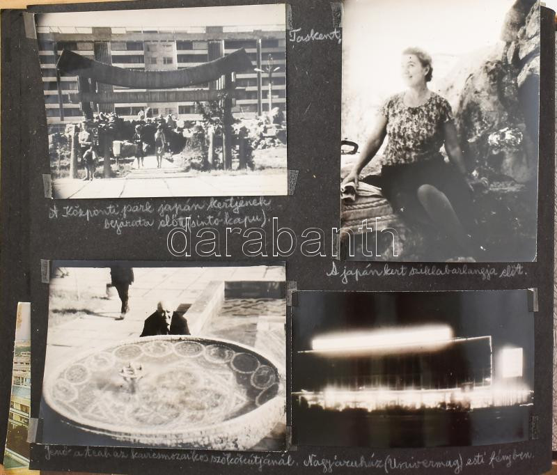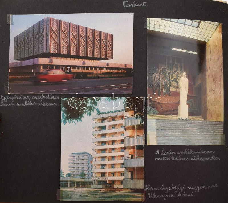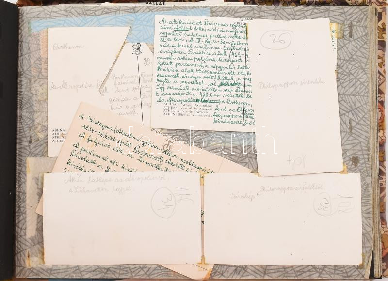 cca 1970-77 egy világutazó érdekes, össz. 14 albuma beragasztott fotókkal, részben körbevágott képeslapokkal, újságkivágásokkal különféle helyszínekről (Spanyolország, Törökország, NDK, Szovjetunió, Görögország), egyes albumlapokon részletesen feliratozva, ragasztás részben meglazult, képeslapok , további 5 db üres, használatlan album, 22x32 cm körüli méretekben. Érdekes, átnézésre érdemes anyag!