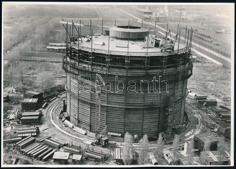 Leírás: cca 1970 Dunaújvárosban gáztárolót építenek, 1 db vintage fotó, jelzés nélkül, ezüst zselatinos fotópapíron, 17,5×24,5 cm