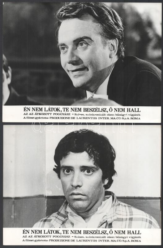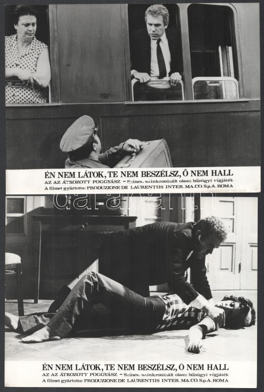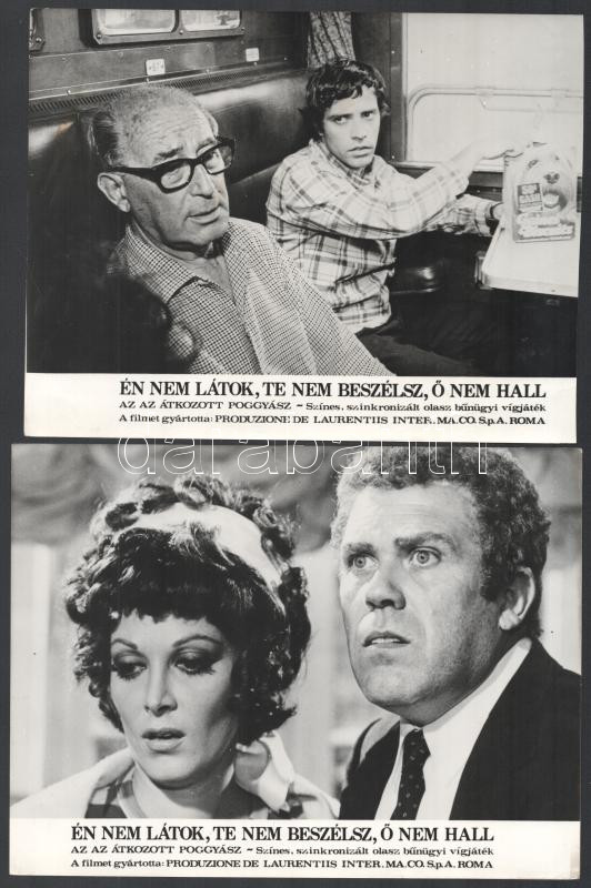 cca 1971 ,,Én nem látok, te nem beszélsz, ő nem hall" című olasz bűnügyi vígjáték jelenetei és szereplői, 10 db vintage produkciós filmfotó ezüst zselatinos fotópapíron, a használatból eredő (esetleges) kisebb hibákkal, 18x24 cm
