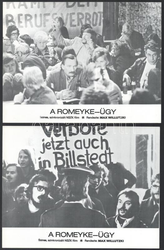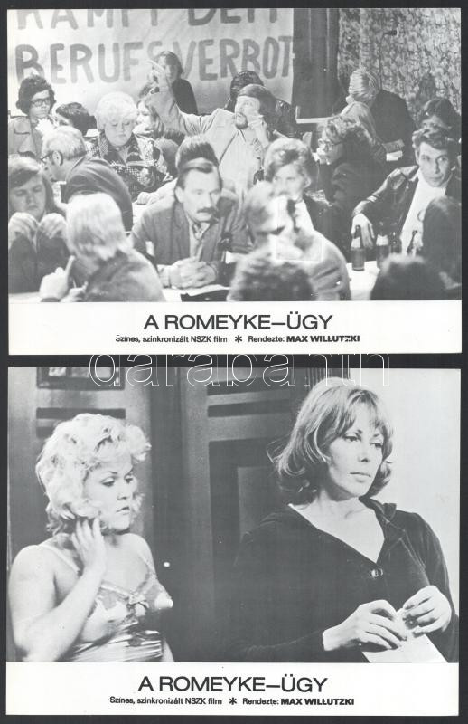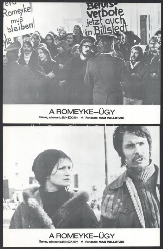 cca 1976 ,,Romeyke-ügy" című NSZK film jelenetei és szereplői, 6 db produkciós filmfotó nyomdatechnikával sokszorosítva kartonpapírra, egyoldalas nyomással, a használatból eredő (esetleges) kisebb hibákkal, 18x24 cm