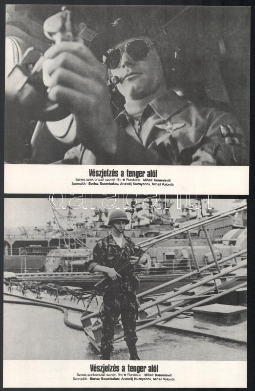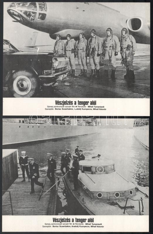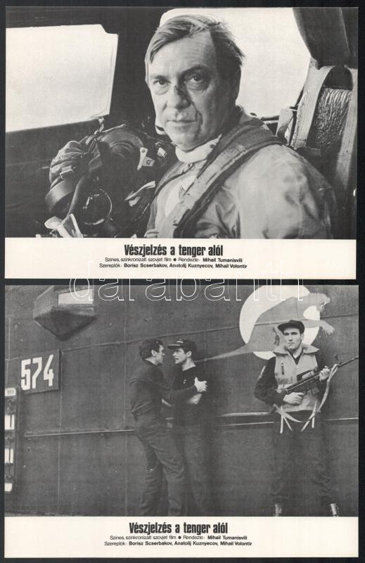 cca 1982 ,,Vészjelzés a tenger alól" című szovjet film jelenetei és szereplői, 6 db produkciós filmfotó nyomdatechnikával sokszorosítva kartonpapírra, egyoldalas nyomással, a használatból eredő (esetleges) kisebb hibákkal, 18x24 cm