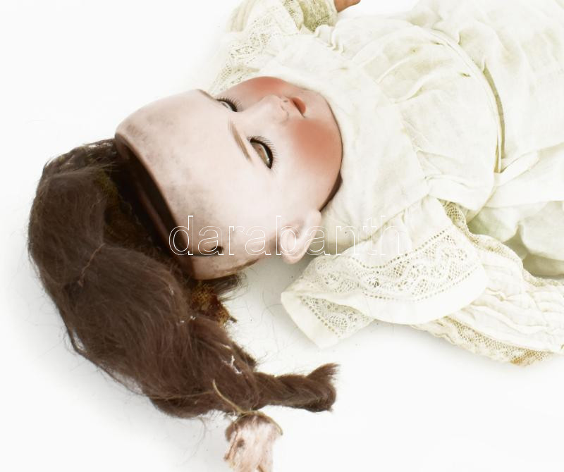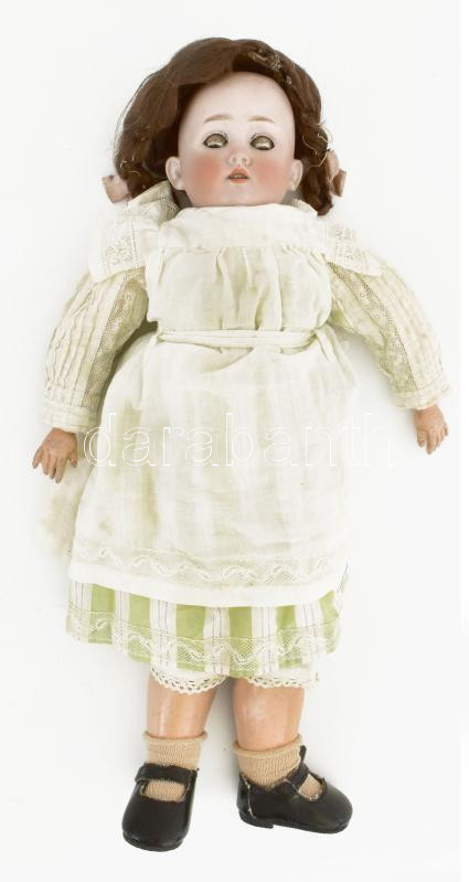 Kestner porcelán baba, Jelzett. Papírmasé, nem hozzávaló fejjel porcelán 0 sorozat 7 cm fejjel. Jelzett 40 cm. Könyökben, térdben, csuklóban mozgatható. Mohair haja lejár. Nyitott szájú, 4 foggal. Piros pecséttel jelzése: Made in Germany. Ruhája régi, de nem eredeti.