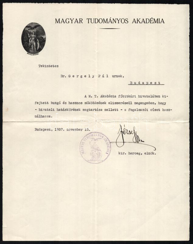 Leírás: 1937 Bp., Habsburg József (1872-1962) főherceg aláírt engedélyező levele