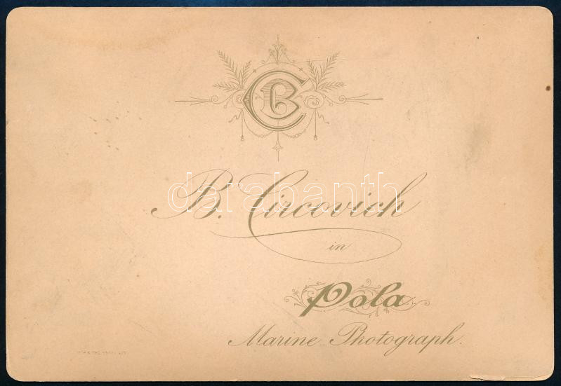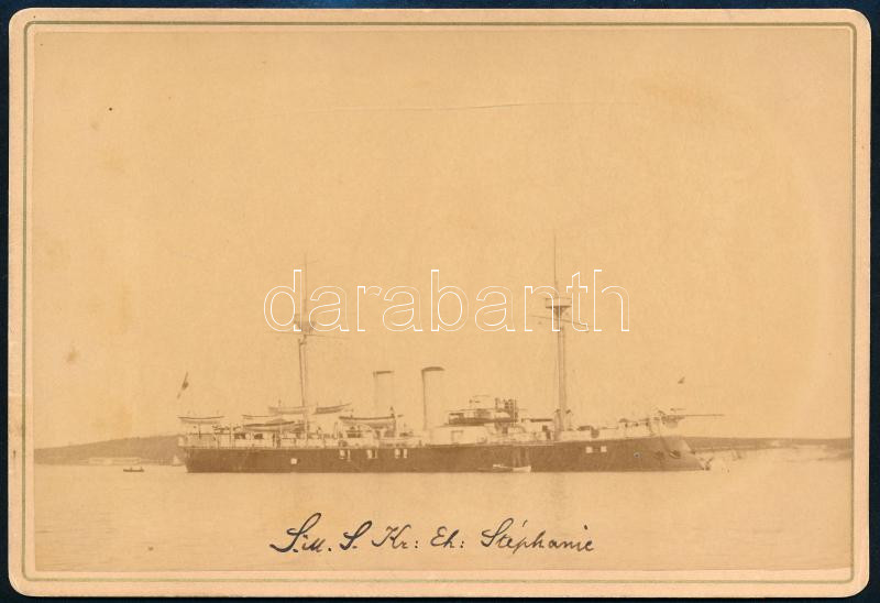 cca 1880 S.M.S. Kronprinzessin Erzherzogin Stephanie hadihajó (1889-1926) teljes oldalsó nézete kabinetfotó. 16,5x11 cm / Full starboard side view of S.M.S. Kroprinzessin Erzherzogin StephanieCabinet photograph by B. Circovich, Marine Photographer, Pola from circa 1870-1890 16.5 cm x 11.0 cm