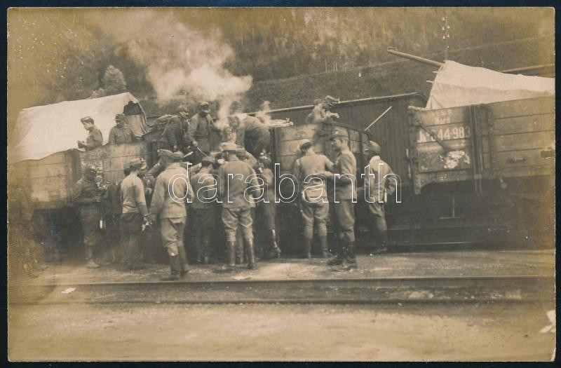 cca 1914-1918 Magyar katonák ebédszünete vasúti megállóban, az egyik vagonon "k.k.St.B. Nord" (osztrák cs. kir. Északi Államvasút) jelöléssel, fotólap, 13,5x8,5 cm