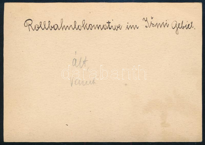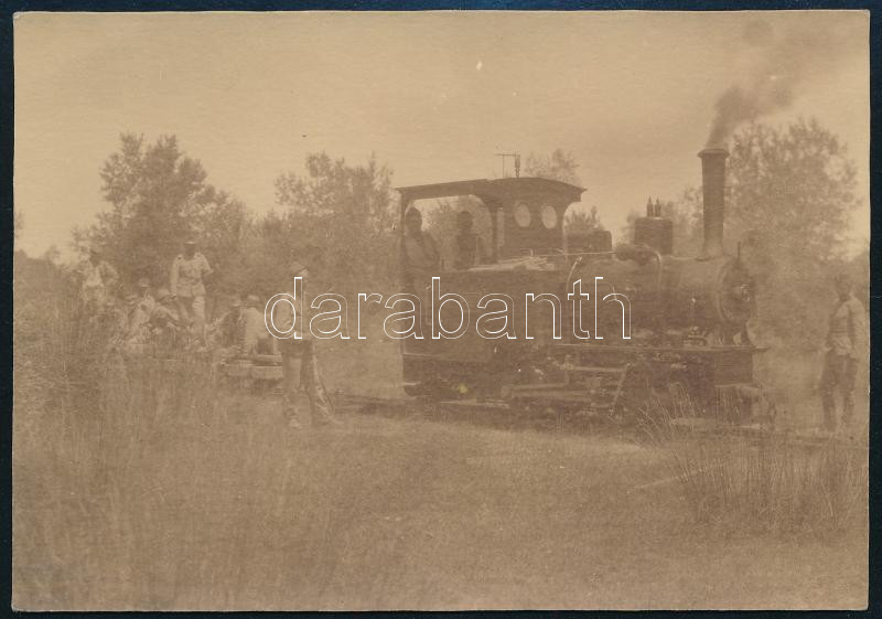 cca 1914-1918 Osztrák-magyar katonák gőzmozdonnyal, fotó, a hátoldalon feliratozva, 10,5x7,5 cm / Austro-Hungarian soldiers with steam locomotive, photo