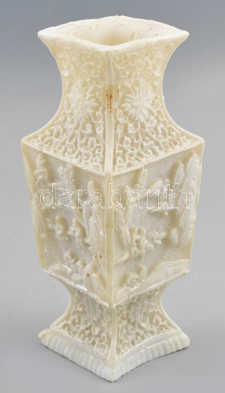Leírás: Antik kínai zsírkő váza, faragott jelenetekkel díszített, kopással, m: 23,5 cm
