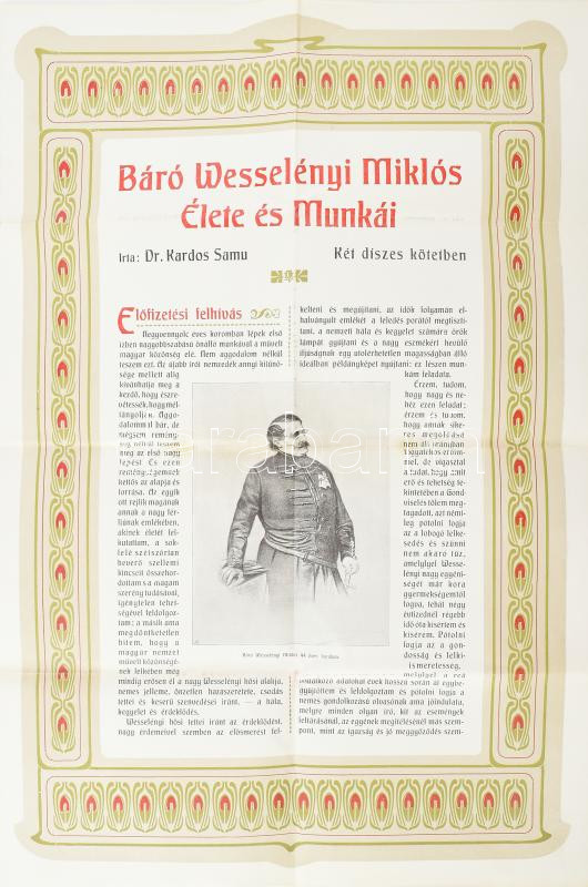 Leírás: 1904 Báró Wesselényi Miklós munkái. dr. Kardos Samu szerk. kötet ismertetője és előfizetési felhívása 4 p Hajtva 48 cm
