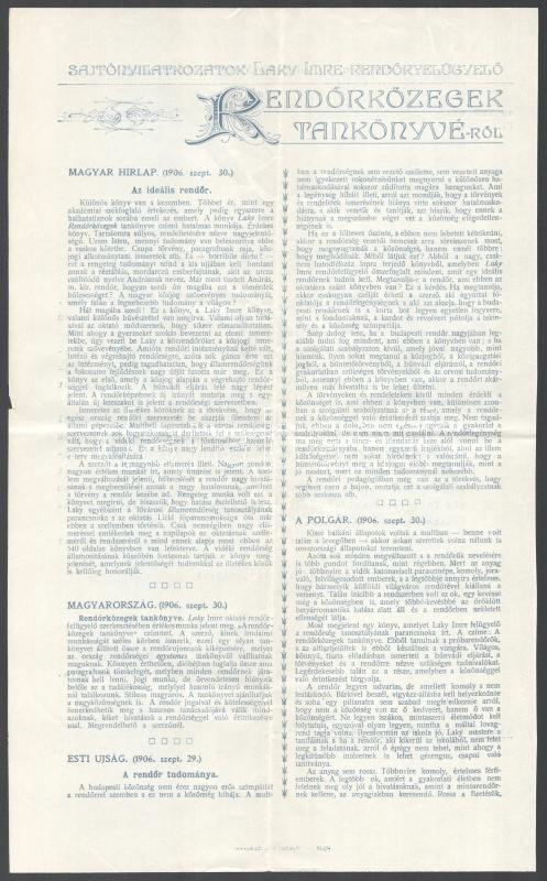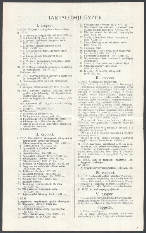 Leírás: 1906 A Rendőrközegek tankönyve c. oktató anyag ismertetője és megrendelője, két illusztrált lap
