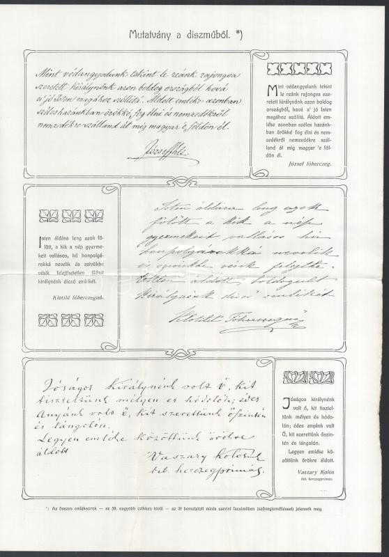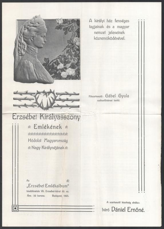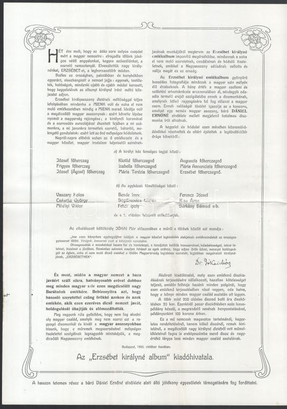 1906 Erzsébet királyasszony emlékének. Hódolat Magyarország nagy királynéjának Erzsébet emlékalbum reklám nyomtatvány, ismertető és előfizetési felhívás 39 cm Hajtva 4 p + 1