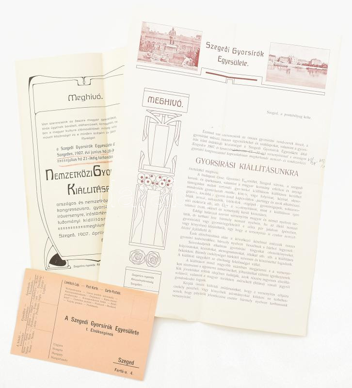 Leírás: 1907 Nemzetközi gyorsírási kiállítás 3 db nyomtatvány: program, meghívó